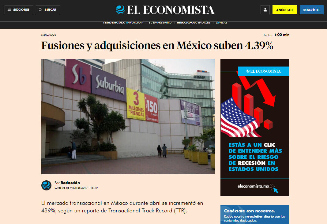 El mercado transaccional en México durante abril se incrementó en 439%, según un reporte de Transactional Track Record (TTR).