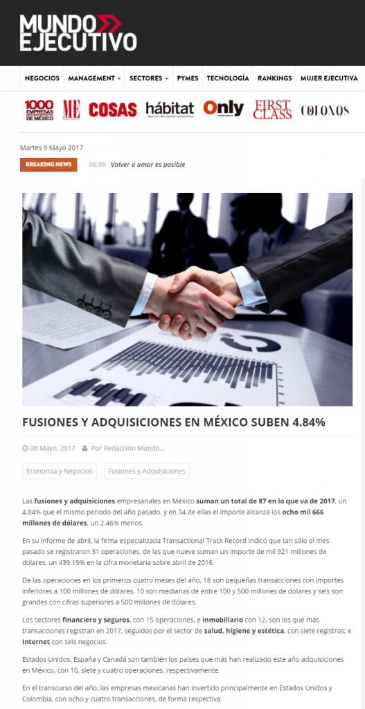 En su informe de abril, la firma especializada Transactional Track Record indicó que tan sólo el mes pasado se registraron 31 operaciones, de las que nueve suman un importe de mil 921 millones de dólares, un 439.19% en la cifra monetaria sobre abril de 2016.