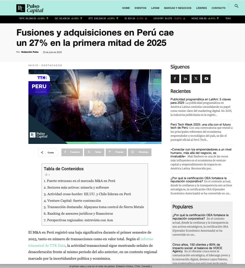 El M&A en Perú registró una baja significativa durante el primer semestre de 2025, tanto en número de transacciones como en valor total. Según el informe trimestral de TTR Data, la actividad transaccional sigue mostrando señales de desaceleración frente al mismo periodo del año anterior, en un contexto regional marcado por la incertidumbre política y económica.