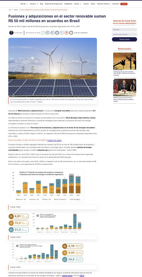 La información aparece en el “Panorama de las fusiones y adquisiciones en el sector de las energías renovables”, realizado de forma independiente por CELA a partir de investigaciones y aportes de actores del mercado solar fotovoltaico y eólico en Brasil. Según el informe, se mapearon más de 50 GW de proyectos y empresas negociados entre 2014 y 2023.