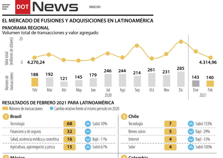 Respecto al panorama de M&A en esta zona del mundo, el reporte detalló que Brasil fue el país con mayor actividad transaccional en este mercado en el hemisferio sur, pues registró un total de 170 operaciones durante el último mes y un aumento interanual de 140% en el capital movilizado, que fue de US$12.030 millones. Sin embargo, frente a los registros de febrero del año anterior, se reportó un descenso interanual de 18% en el número de operaciones realizadas.
