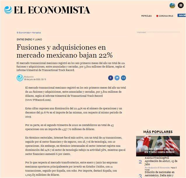 El mercado transaccional mexicano registró en los seis primeros meses del año un total de 121 fusiones y adquisiciones, entre anunciadas y cerradas, por 3,802 millones de dólares, según el informe trimestral de Transactional Track Record.