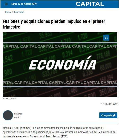 En los primeros tres meses del año se registraron en México 61 operaciones de fusiones o adquisiciones, las cuales alcanzaron un monto de tres mil 543 millones de dólares, de acuerdo con Transactional Track Record (TTR).