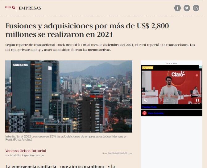 "La emergencia sanitaria –que aún se mantiene– y la coyuntura política hicieron que el 2021 fuera un año con altas y bajas en cuanto a operaciones de compra y venta de empresas, activos o inyecciones de capital. Así, el 2021 cerró con un total de 115 operaciones en el país (US$ 4,128 millones), de las cuales 101 se concluyeron y 14 se encuentran en curso, con posibilidad de cerrar en los próximos meses. Y fueron las transacciones del tipo M&A (fusiones y adquisiciones) las que marcaron la pauta el año pasado, con un total de 77, según el último reporte de Transactional Track Record (TTR). Estas operaciones movieron un monto de US$ 2,822 millones.
