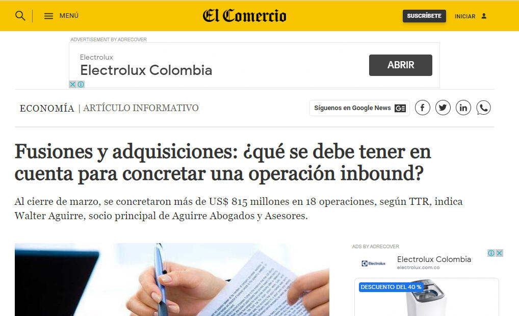 Aunque a paso lento, las fusiones y adquisiciones empresariales en el Perú han continuado y en especial las operaciones consideradas inbound, es decir, empresas extranjeras que adquieren compañías peruanas.