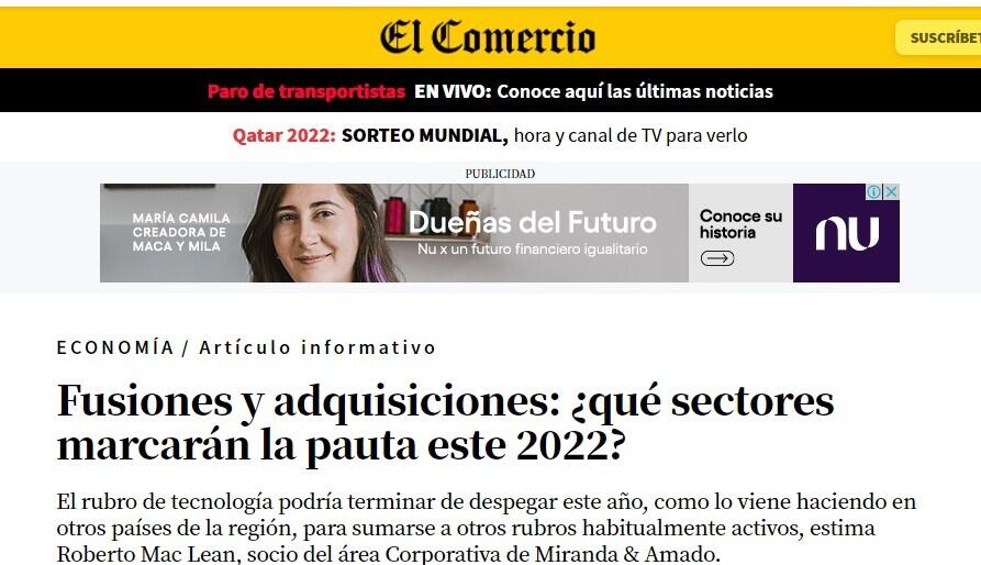 Espera también que el sector de tecnología termine de despegar este 2022, tal como se está dando en toda la región. “El Perú podría tener una importante explosión en transacciones pequeñas y medianas en los próximos años, como lo han tenido países como México, Chile y Colombia. Esto dependerá de cómo maduren varios proyectos de tecnología interesantes en el país”, detalla.