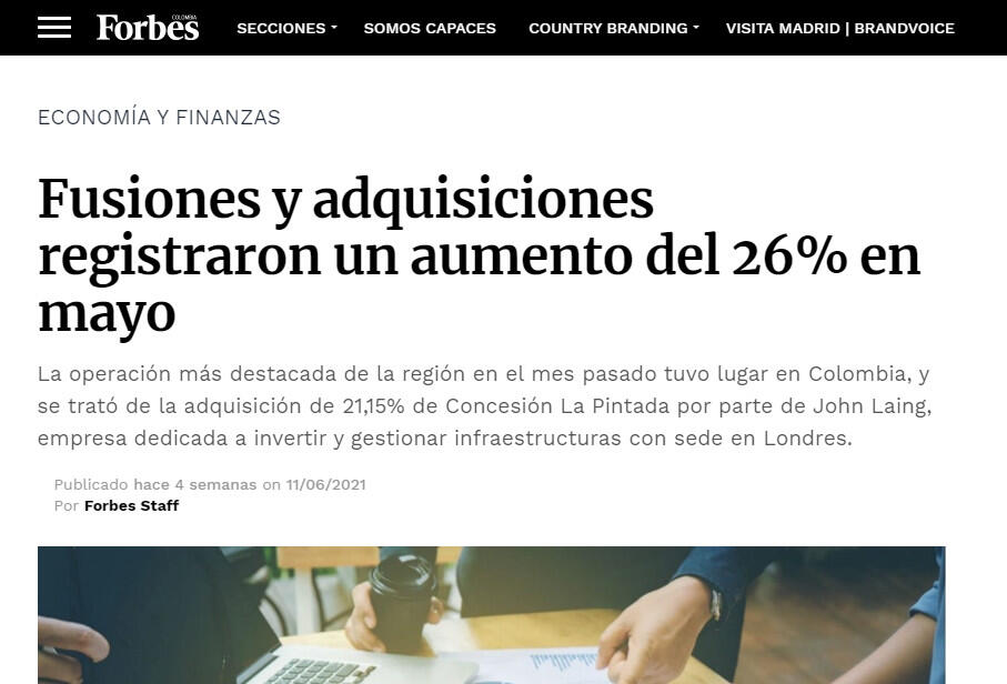 La operación más destacada de la región en el mes pasado tuvo lugar en Colombia, y se trató de la adquisición de 21,15% de Concesión La Pintada por parte de John Laing, empresa dedicada a invertir y gestionar infraestructuras con sede en Londres. La operación, valorada en US$44,17 millones, estuvo asesorada en la parte legal por Philippi, Prietocarrizosa Ferrero DU & Uría C, mientras que en el apartado financiero tuvo el apoyo de la Banca de Inversión Bancolombia.