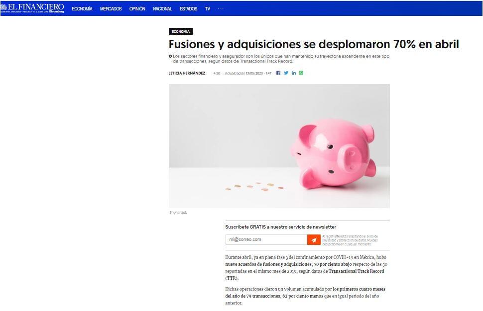 Durante abril, ya en plena fase 3 del confinamiento por COVID-19 en México, hubo nueve acuerdos de fusiones y adquisiciones, 70 por ciento abajo respecto de las 30 reportadas en el mismo mes de 2019, según datos de Transactional Track Record (TTR).