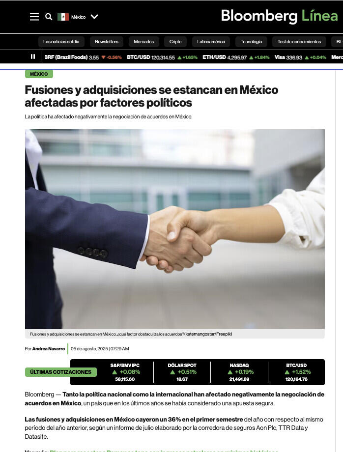 Las fusiones y adquisiciones (M&A) en México muestran una tendencia a la baja en los últimos meses, afectadas por factores políticos y de incertidumbre regulatoria, según datos y análisis de consultoras especializadas como TTR, ITR Daily y Dealogic.