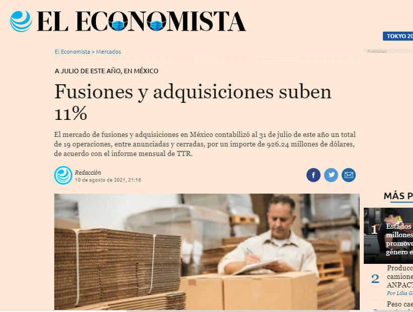El mercado de fusiones y adquisiciones en México contabilizó al 31 de julio de este año un total de 19 operaciones, entre anunciadas y cerradas, por un importe de 926.24 millones de dólares, de acuerdo con el informe mensual de TTR.