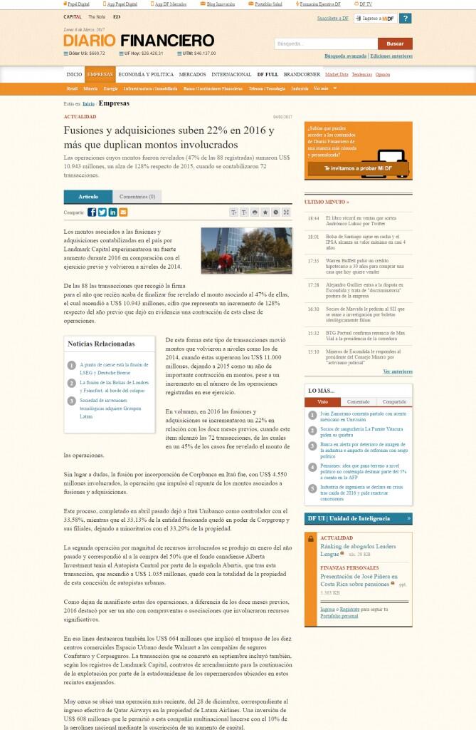 Los montos asociados a las fusiones y adquisiciones contabilizadas en el país por Landmark Capital experimentaron un fuerte aumento durante 2016 en comparación con el ejercicio previo y volvieron a niveles de 2014.
