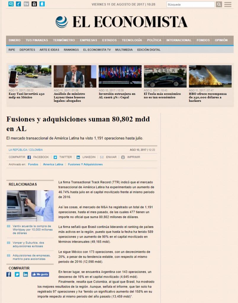 La firma Transactional Track Record (TTR) indicó que el mercado transaccional de América Latina ha experimentado un aumento de 46.74% hasta julio en el capital movilizado frente al mismo periodo de 2016.