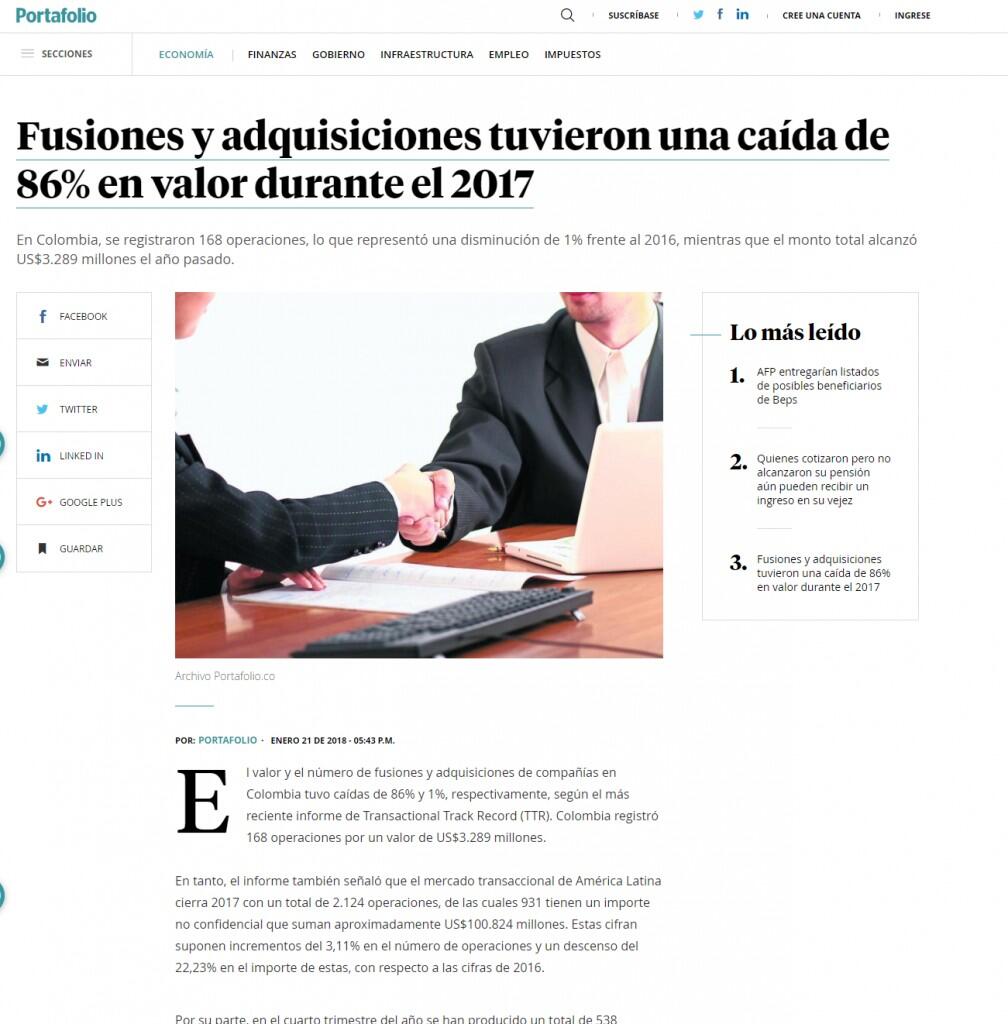 En Colombia, se registraron 168 operaciones, lo que representó una disminución de 1% frente al 2016, mientras que el monto total alcanzó US$3.289 millones el año pasado.