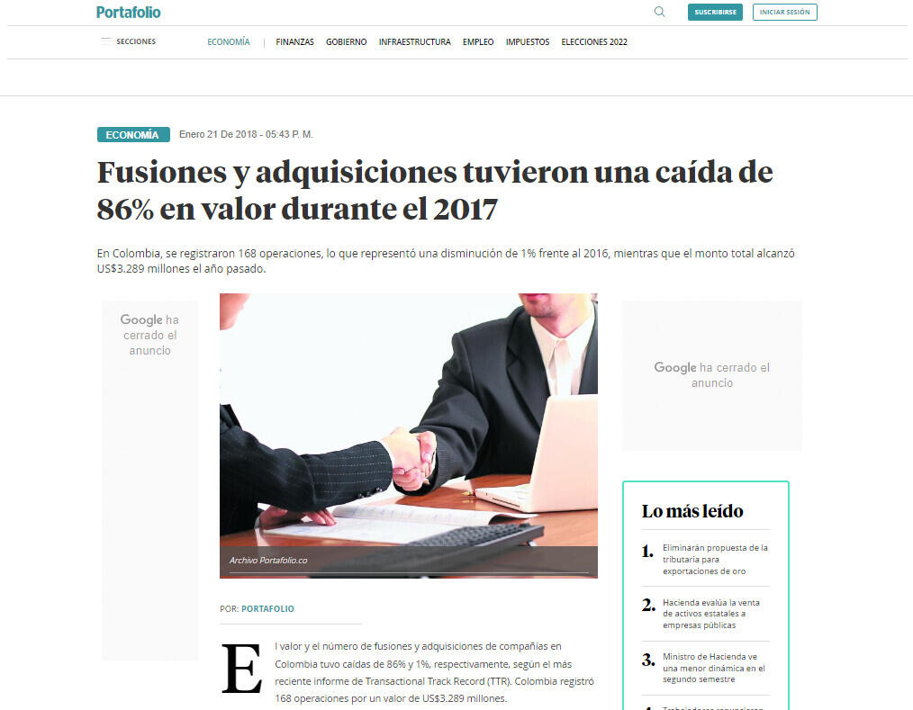 En Colombia, se registraron 168 operaciones, lo que representó una disminución de 1% frente al 2016, mientras que el monto total alcanzó US$3.289 millones el año pasado.