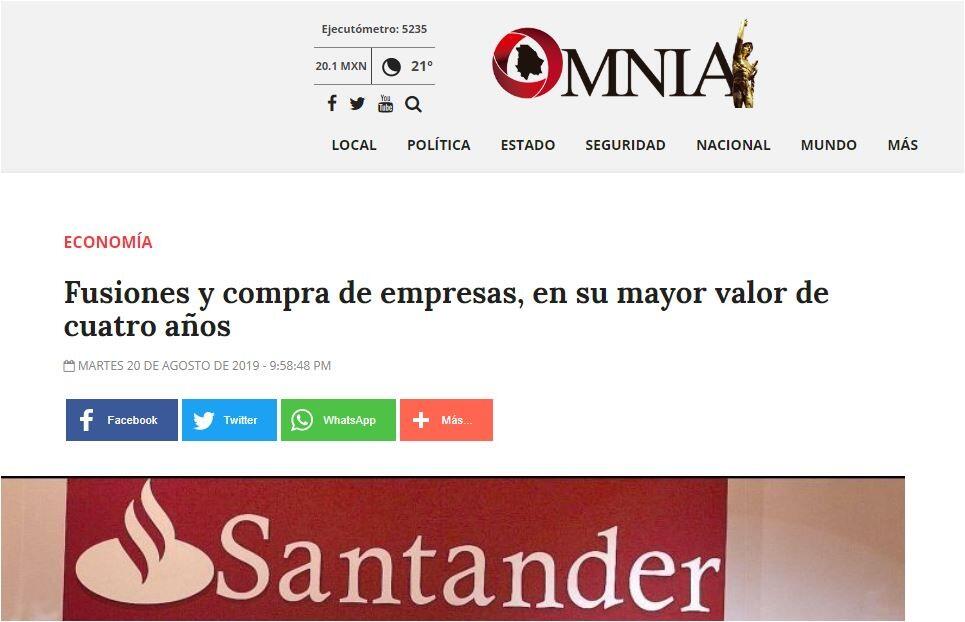 El sector financiero es el más activo en operaciones de fusiones y adquisiciones, al reportar un valor de 5 mil 900 millones de dólares, mil 400 más que en 2018; le sigue energía con 3 mil 500 millones y telecomunicaciones con 589.3 millones de dólares.