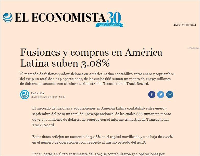 El mercado de fusiones y adquisiciones en América Latina contabilizó entre enero y septiembre del 2019 un total de 1,629 operaciones, de las cuales 666 suman un monto de 71,297 millones de dólares, de acuerdo con el informe trimestral de Transactional Track Record.