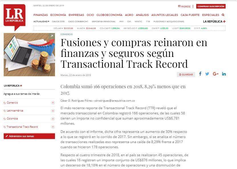 El más reciente reporte de Transactional Track Record (TTR) reveló que el mercado transaccional en Colombia registró 166 operaciones, de las cuales 58 tienen un importe no confidencial que suman aproximadamente US$6.781 millones.