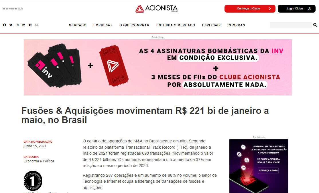 O cenário de operações de M&A no Brasil segue em alta. Segundo relatório da plataforma Transactional Track Record (TTR), de janeiro a maio de 2021 foram registradas 693 transações, movimentando o valor de R$ 221 bilhões. Os números representam um aumento de 37% em relação ao mesmo período de 2020.