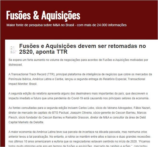 Perspectivas de Fusões e Aquisições — O contato pessoal que é exigido na negociação de acordos de fusões e aquisições tornou- se impossível nas condições atuais. A dificuldade de executar negócios sem reuniões presenciais, visitas ao local e due diligence levará as fusões e aquisições para o terceiro e quarto trimestre, com negociações realmente sendo retomadas apenas no segundo semestre, disse Reinaldo Grasson, diretor de fusões e aquisições de Deloitte.
