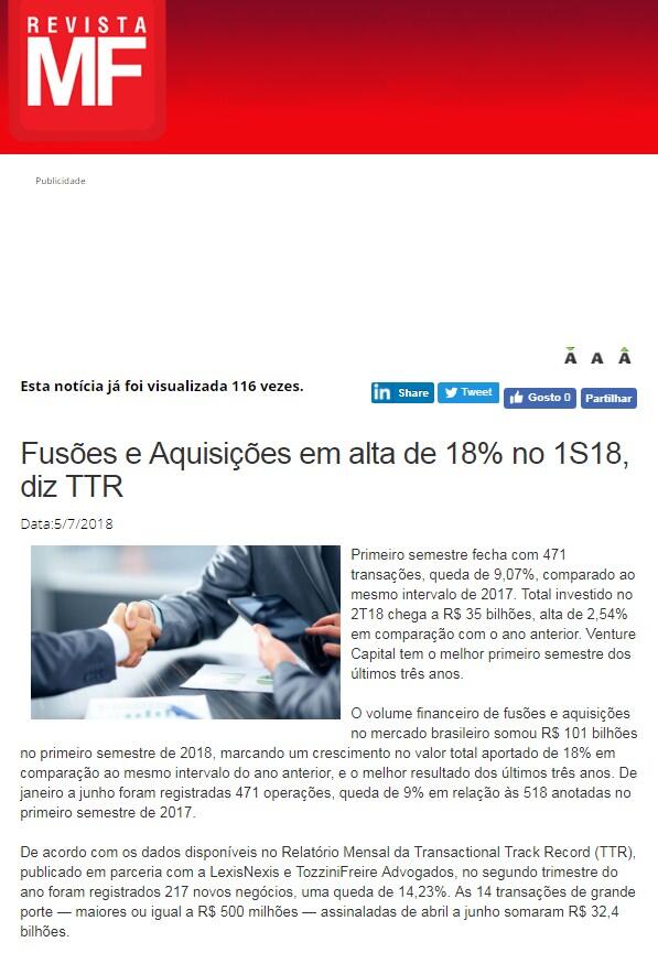 O volume financeiro de fusões e aquisições no mercado brasileiro somou R$ 101 bilhões no primeiro semestre de 2018, marcando um crescimento no valor total aportado de 18% em comparação ao mesmo intervalo do ano anterior, e o melhor resultado dos últimos três anos. De janeiro a junho foram registradas 471 operações, queda de 9% em relação às 518 anotadas no primeiro semestre de 2017.
