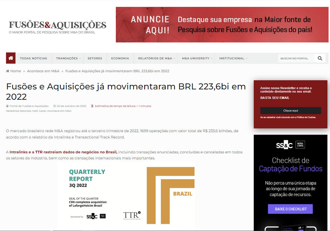 O mercado brasileiro rede M&A registrou até o terceiro trimestre de 2022, 1699 operações com valor total de R$ 233,6 bilhões, de acordo com o relatório da Intralinks e Transactional Track Record.