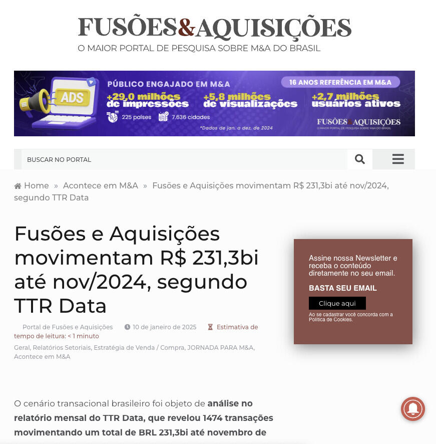 O cenário transacional brasileiro foi objeto de análise no relatório mensal do TTR Data, que revelou 1474 transações movimentando um total de BRL 231,3bi até novembro de 2024.