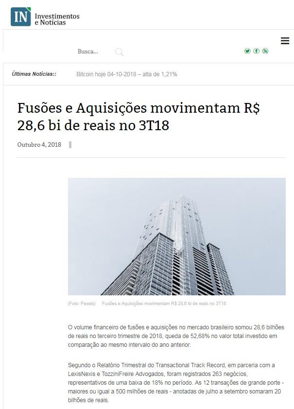 Segundo o Relatório Trimestral do Transactional Track Record, em parceria com a LexisNexis e TozziniFreire Advogados, foram registrados 263 negócios, representativos de uma baixa de 18% no período. As 12 transações de grande porte - maiores ou igual a 500 milhões de reais - anotadas de julho a setembro somaram 20 bilhões de reais.