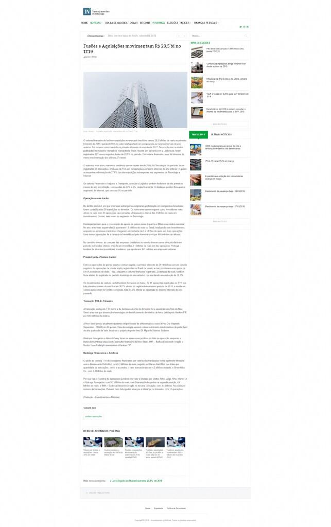 O volume financeiro de fusões e aquisições no mercado brasileiro somou 29,5 bilhões de reais no primeiro trimestre de 2019, queda de 56% no valor total aportado em comparação ao mesmo intervalo do ano anterior. Foi o menor valor investido no primeiro trimestre do ano desde 2017. De acordo com os dados publicados no Relatório Mensal da Transactional Track Record, em parceria com a LexisNexis, foram registrados 223 novos negócios, baixa de 20,5% no período. Em volume financeiro, esse foi trimestre de menor movimentação dos últimos 27 meses.