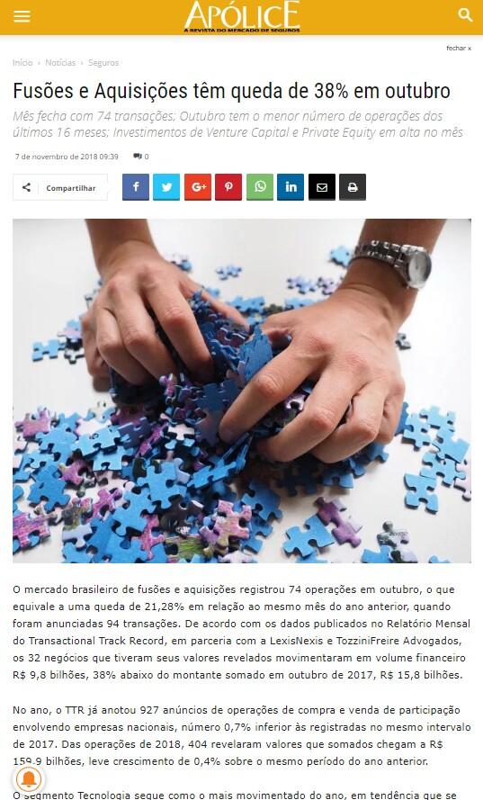 O mercado brasileiro de fusões e aquisições registrou 74 operações em outubro, o que equivale a uma queda de 21,28% em relação ao mesmo mês do ano anterior, quando foram anunciadas 94 transações. De acordo com os dados publicados no Relatório Mensal do Transactional Track Record, em parceria com a LexisNexis e TozziniFreire Advogados, os 32 negócios que tiveram seus valores revelados movimentaram em volume financeiro R$ 9,8 bilhões, 38% abaixo do montante somado em outubro de 2017, R$ 15,8 bilhões.