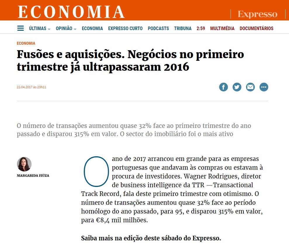 O ano de 2017 arrancou em grande para as empresas portuguesas que andavam às compras ou estavam à procura de investidores. Wagner Rodrigues, diretor de business intelligence da TTR —Transactional Track Record, fala deste primeiro trimestre com otimismo. O número de transações aumentou quase 32% face ao período homólogo do ano passado, para 95, e disparou 315% em valor, para €8,4 mil milhões.