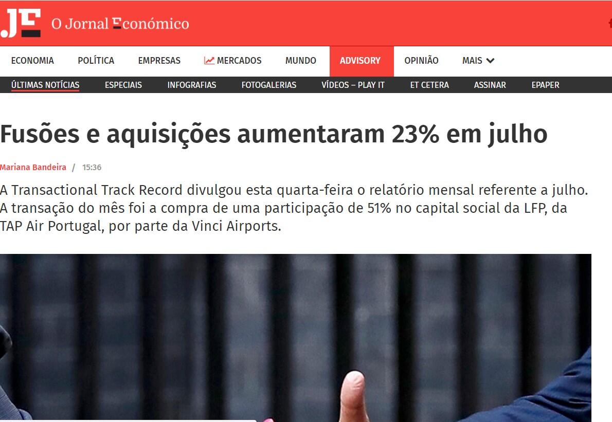 A Transactional Track Record divulgou esta quarta-feira o relatório mensal referente a julho. A transação do mês foi a compra de uma participação de 51% no capital social da LFP, da TAP Air Portugal, por parte da Vinci Airports.