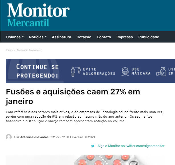 No primeiro mês de 2021 o mercado transacional brasileiro registrou 68 fusões e aquisições, das quais 39 tiveram valores divulgados que somam BRL 56,3bi, segundo dados do TTR. O volume registrado em janeiro é 27% inferior ao do mesmo mês de 2020.