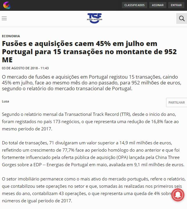 A transação destacada pelo TTR no mês de julho foi a aquisição, pela espanhola Merlin Properties, do centro comercial Almada Fórum à norte-americana Blackstone por 406,7 milhões de euros.