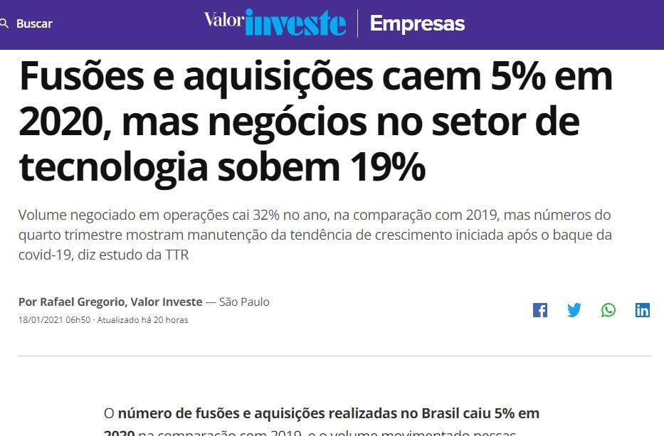 Os números do quarto trimestre, por outro lado, mostram manutenção da tendência de recuperação iniciada no segundo trimestre do ano, logo após o baque da covid-19. Foram 491 negócios nos meses de outubro, novembro e dezembro, apenas 3% a menos que no mesmo período de 2019, e elas movimentaram R$ 81,4 bilhões, segundo a TTR.