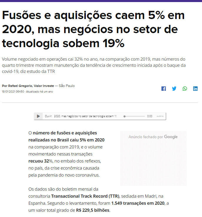 Os números do quarto trimestre, por outro lado, mostram manutenção da tendência de recuperação iniciada no segundo trimestre do ano, logo após o baque da covid-19. Foram 491 negócios nos meses de outubro, novembro e dezembro, apenas 3% a menos que no mesmo período de 2019, e elas movimentaram R$ 81,4 bilhões, segundo a TTR.