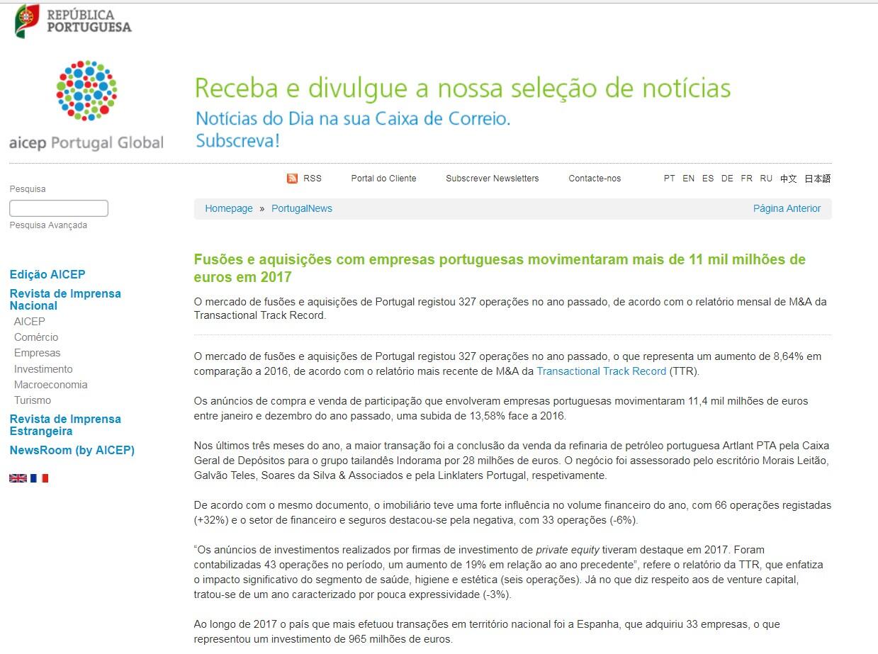 O mercado de fusões e aquisições de Portugal registou 327 operações no ano passado, o que representa um aumento de 8,64% em comparação a 2016, de acordo com o relatório mais recente de M&A da Transactional Track Record (TTR).