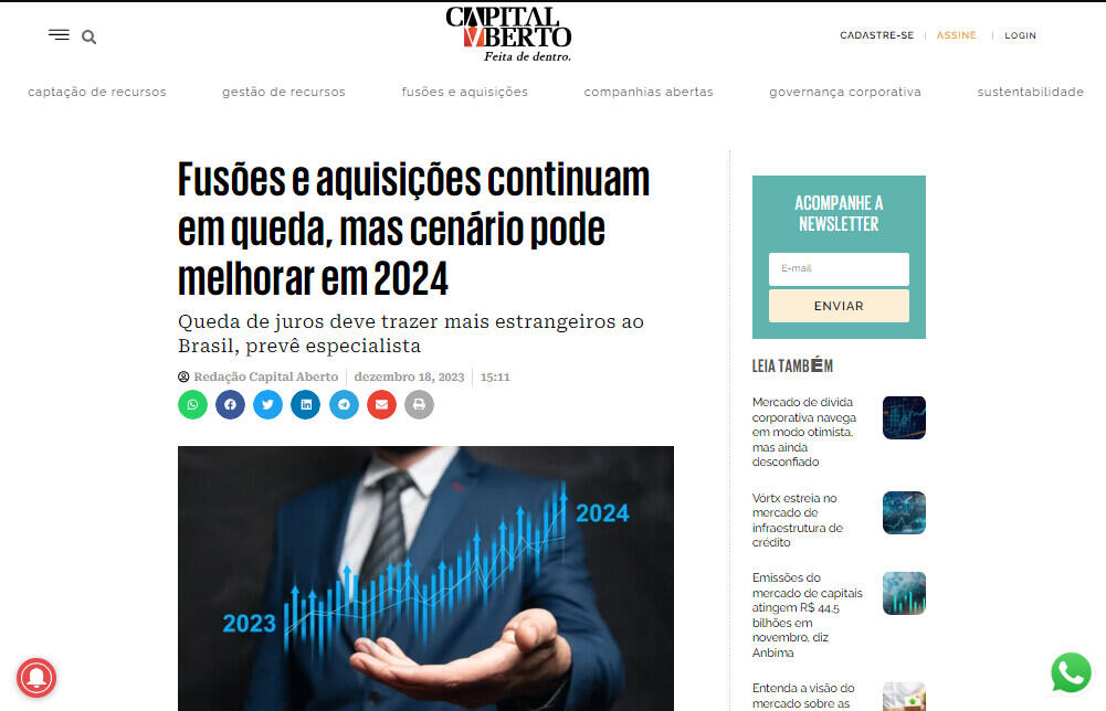 Depois de tanta retração, para 2024 o cenário pode ser mais promissor. Na avaliação de Laura Affonso, sócia da prática de Societário e M&A (Mergers and Acquisitions) do escritório de advocacia Lefosse, o ano que vem deve ser “significativamente melhor” para o segmento.