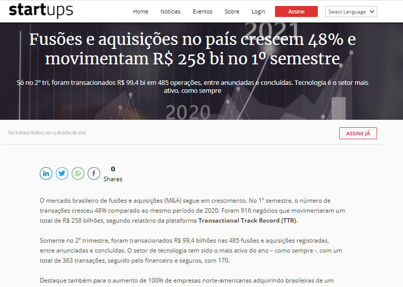 O mercado brasileiro de fusões e aquisições (M&A) segue em crescimento. No 1º semestre, o número de transações cresceu 48% comparado ao mesmo período de 2020. Foram 916 negócios que movimentaram um total de R$ 258 bilhões, segundo relatório da plataforma Transactional Track Record.
