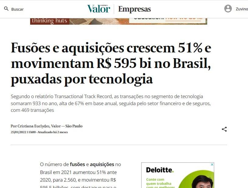 O número de transações de fusões e aquisições no Brasil em 2021 aumentou 51% ante 2020, para 2.560, e movimentou R$ 595,5 bilhões, com destaque para o setor de tecnologia, mostram os dados do relatório anual do Transactional Track Record (TTR).