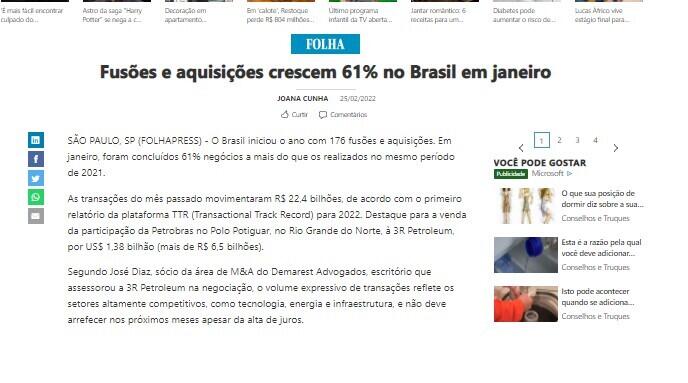 Segundo José Diaz, sócio da área de M&A do Demarest Advogados, escritório que assessorou a 3R Petroleum na negociação, o volume expressivo de transações reflete os setores altamente competitivos, como tecnologia, energia e infraestrutura, e não deve arrefecer nos próximos meses apesar da alta de juros.