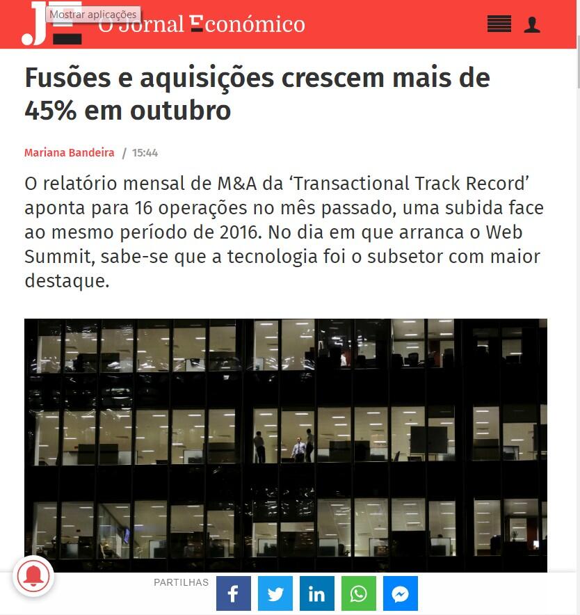 O mercado de fusões e aquisições de Portugal cresceu no mês passado, quando comparado com o mesmo período de 2016. Registaram-se 16 transações em outubro, o que corresponde a um salto de aproximadamente 45,86%, segundo o relatório mensal de M&A da Transactional Track Record (TTR).