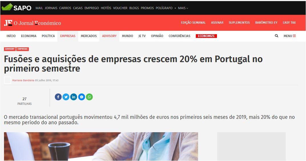 Fusões e aquisições de empresas crescem 20% em Portugal no primeiro semestre