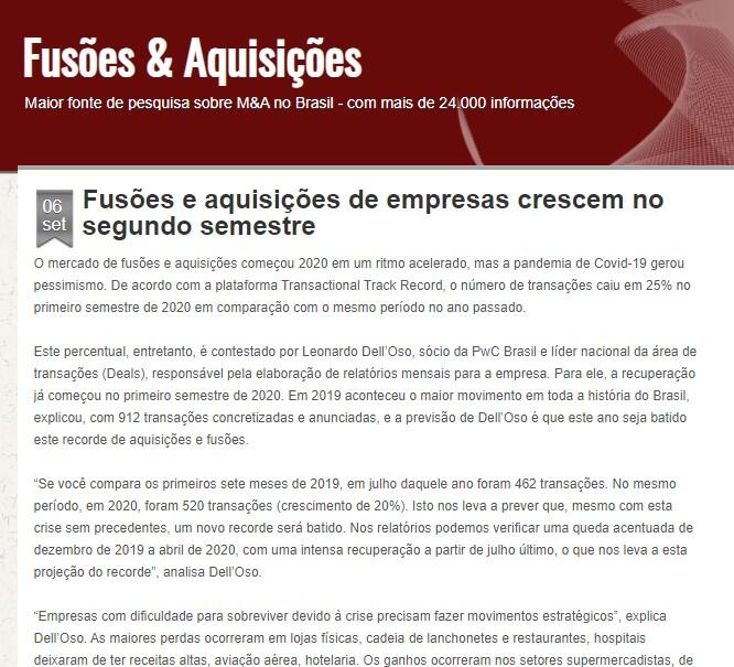 Este percentual, entretanto, é contestado por Leonardo Dell’Oso, sócio da PwC Brasil e líder nacional da área de transações (Deals), responsável pela elaboração de relatórios mensais para a empresa. Para ele, a recuperação já começou no primeiro semestre de 2020. Em 2019 aconteceu o maior movimento em toda a história do Brasil, explicou, com 912 transações concretizadas e anunciadas, e a previsão de Dell’Oso é que este ano seja batido este recorde de aquisições e fusões.