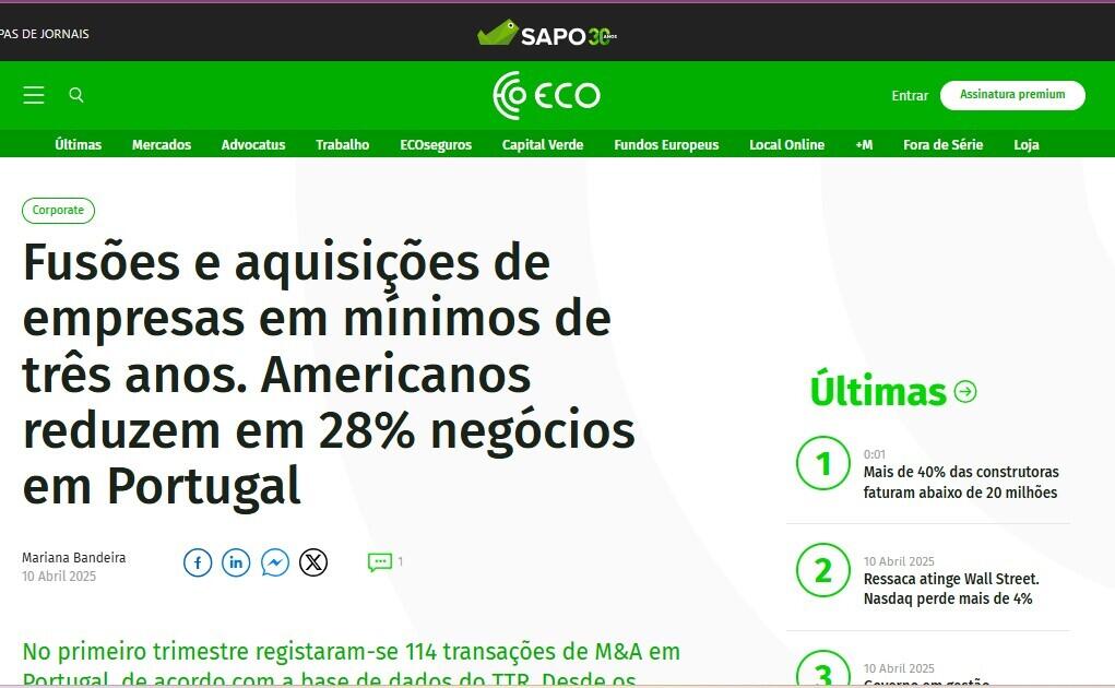 Fusões e aquisições de empresas em mínimos de três anos. Americanos reduzem em 28% negócios em Portugal
