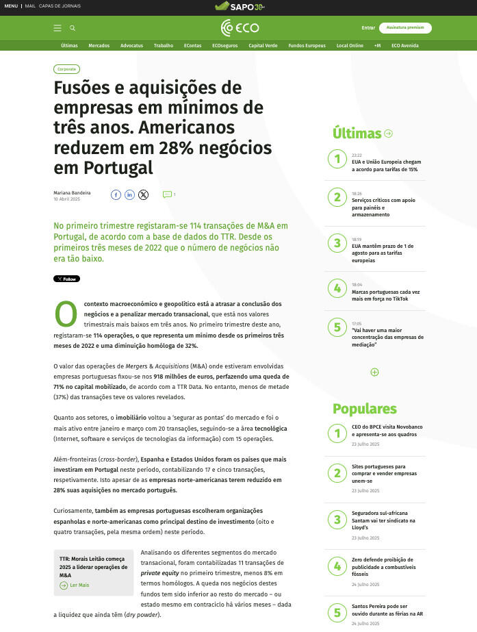 TTR: Morais Leitão começa 2025 a liderar operações de M&A