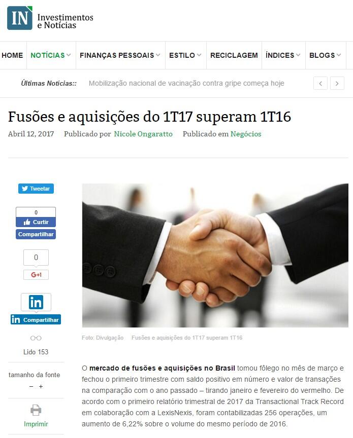Fusões e aquisições do 1T17 superam 1T16