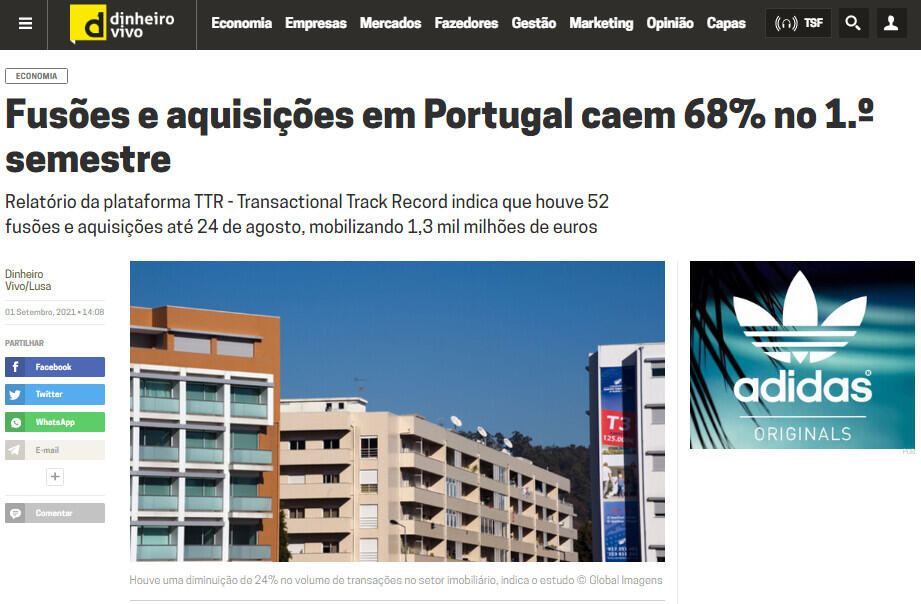 Relatório da plataforma TTR - Transactional Track Record indica que houve 52 fusões e aquisições até 24 de agosto, mobilizando 1,3 mil milhões de euros