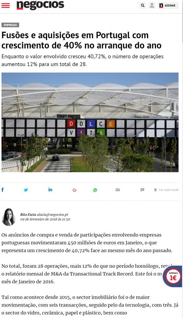 Em Janeiro, houve 14 operações "inbound", em que empresas portuguesas foram adquiridas por companhias estrangeiras. De acordo com o relatório, "Espanha iniciou o ano mantendo o apetite que demonstrou em 2017 por companhias portuguesa". Isto porque, só no primeiro mês de 2018, já foram contabilizadas três transacções que totalizaram 105 milhões de euros investidos no país. Desse total, 86 milhões são provenientes da aquisição pela espanhola ORES Socimi de activos comerciais imobiliários, incluindo supermercados e lojas.