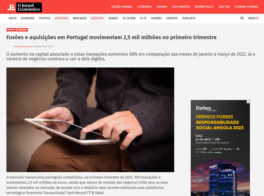 O mercado transacional português contabilizou, no primeiro trimestre de 2023, 109 transações e movimentou 2,5 mil milhões de euros, sendo que menos de metade dos negócios (45%) teve os seus valores revelados ao mercado, de acordo com o relatório mais recente elaborado pela plataforma tecnológico-financeira Transactional Track Record (TTR Data).