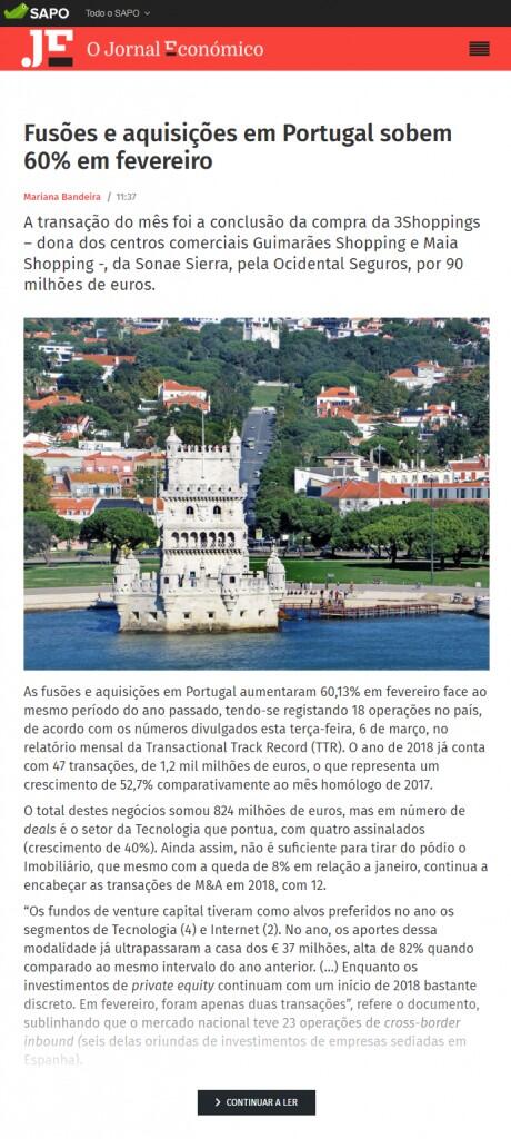 “Os fundos de venture capital tiveram como alvos preferidos no ano os segmentos de Tecnologia (4) e Internet (2). No ano, os aportes dessa modalidade já ultrapassaram a casa dos € 37 milhões, alta de 82% quando comparado ao mesmo intervalo do ano anterior. (…) Enquanto os investimentos de private equity continuam com um início de 2018 bastante discreto. Em fevereiro, foram apenas duas transações”, refere o documento, sublinhando que o mercado nacional teve 23 operações de cross-border inbound (seis delas oriundas de investimentos de empresas sediadas em Espanha).